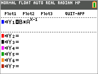 For the first part of this activity, students explore geometric sequences graphically by varying the value of A, the common ratio. Pressing the right or left arrows will change the value of A and updates the graph each time.