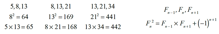 between any three consecutive terms of the Fibonacci sequence. Pick a term and square it. Multiply the term before